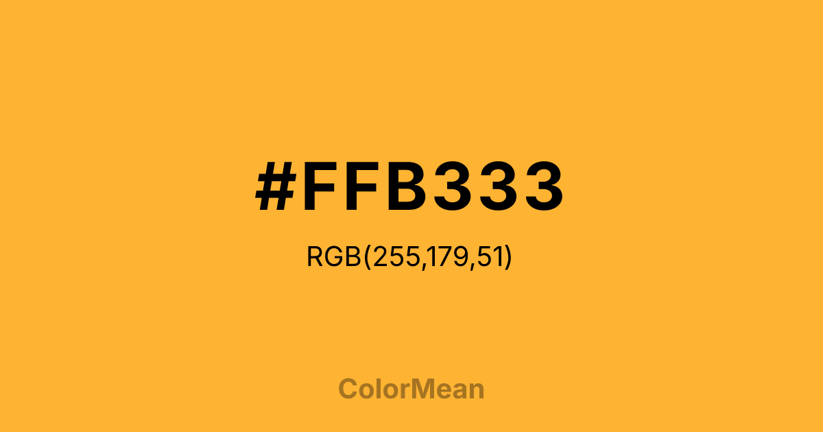 #FFB333 RGB value is (255, 179, 51). The hex color red value is 255, green is 179, and blue is 51. Its HSL format shows a hue of 38°, saturation of 100 percent, and lightness of 60 percent. The CMYK process values are 0 percent, 30 percent, 80 percent, 0 percent.