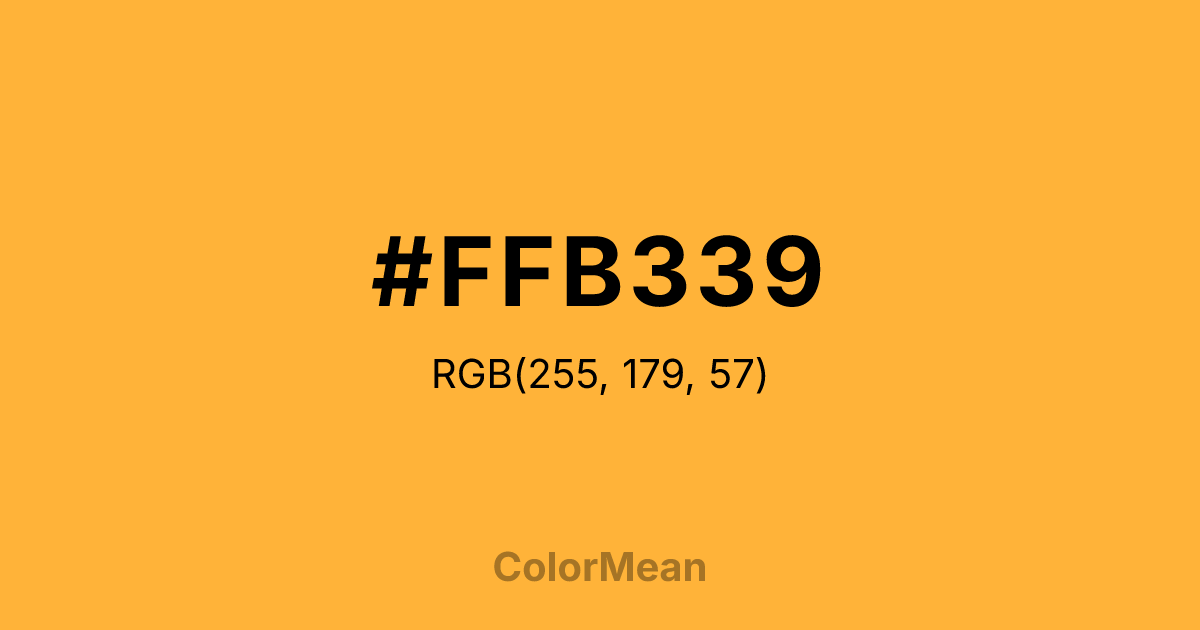 #FFB339 RGB value is (255, 179, 57). The hex color red value is 255, green is 179, and blue is 57. Its HSL format shows a hue of 37°, saturation of 100 percent, and lightness of 61 percent. The CMYK process values are 0 percent, 30 percent, 78 percent, 0 percent.