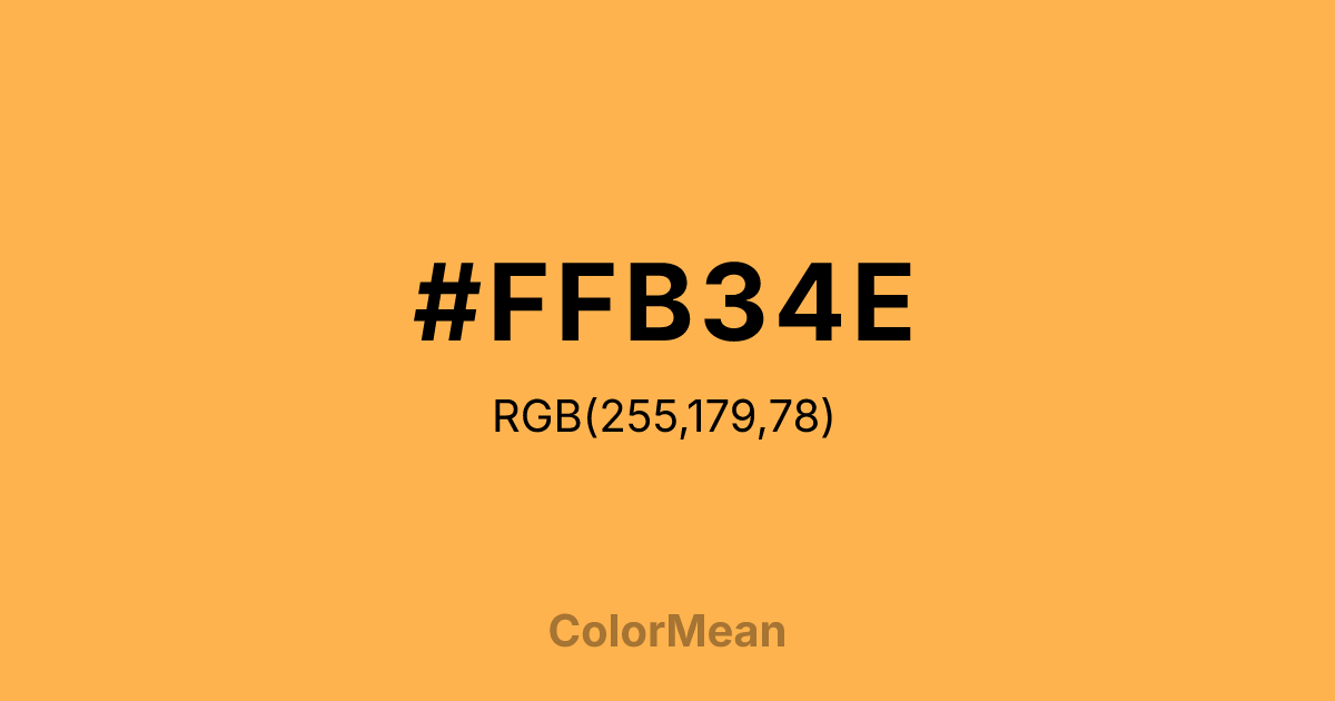 #FFB34E RGB value is (255, 179, 78). The hex color red value is 255, green is 179, and blue is 78. Its HSL format shows a hue of 34°, saturation of 100 percent, and lightness of 65 percent. The CMYK process values are 0 percent, 30 percent, 69 percent, 0 percent.