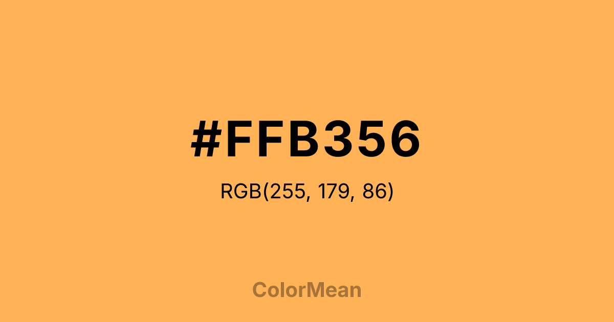 #FFB356 RGB value is (255, 179, 86). The hex color red value is 255, green is 179, and blue is 86. Its HSL format shows a hue of 33°, saturation of 100 percent, and lightness of 67 percent. The CMYK process values are 0 percent, 30 percent, 66 percent, 0 percent.