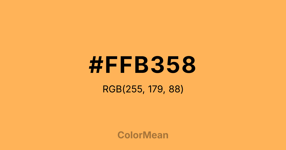 #FFB358 RGB value is (255, 179, 88). The hex color red value is 255, green is 179, and blue is 88. Its HSL format shows a hue of 33°, saturation of 100 percent, and lightness of 67 percent. The CMYK process values are 0 percent, 30 percent, 65 percent, 0 percent.