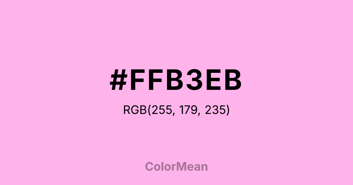 #FFB3EB RGB value is (255, 179, 235). The hex color red value is 255, green is 179, and blue is 235. Its HSL format shows a hue of 316°, saturation of 100 percent, and lightness of 85 percent. The CMYK process values are 0 percent, 30 percent, 8 percent, 0 percent.