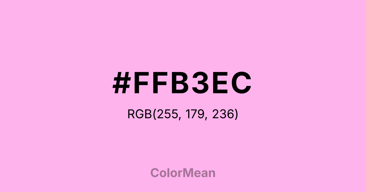 #FFB3EC RGB value is (255, 179, 236). The hex color red value is 255, green is 179, and blue is 236. Its HSL format shows a hue of 315°, saturation of 100 percent, and lightness of 85 percent. The CMYK process values are 0 percent, 30 percent, 7 percent, 0 percent.