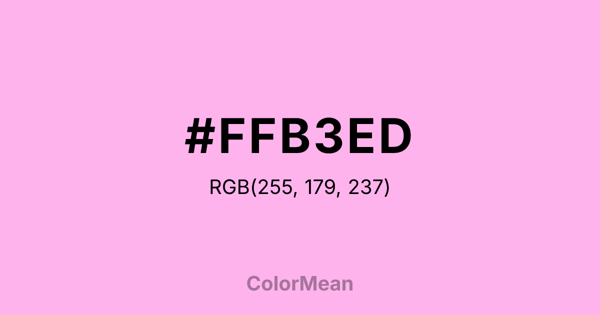 #FFB3ED RGB value is (255, 179, 237). The hex color red value is 255, green is 179, and blue is 237. Its HSL format shows a hue of 314°, saturation of 100 percent, and lightness of 85 percent. The CMYK process values are 0 percent, 30 percent, 7 percent, 0 percent.