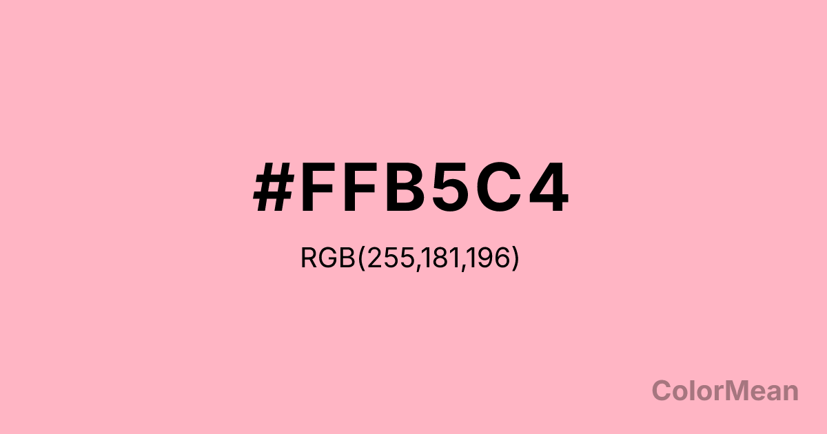 #FFB5C4 RGB value is (255, 181, 196). The hex color red value is 255, green is 181, and blue is 196. Its HSL format shows a hue of 348°, saturation of 100 percent, and lightness of 85 percent. The CMYK process values are 0 percent, 29 percent, 23 percent, 0 percent.
