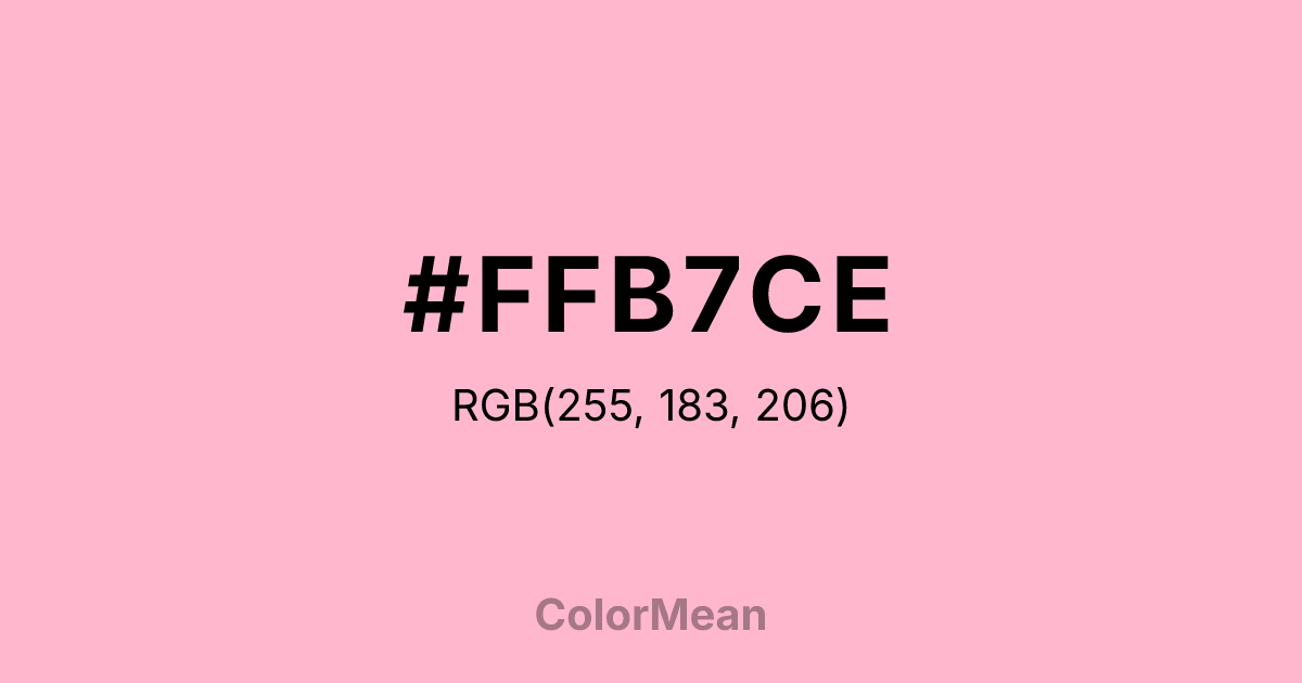 #FFB7CE RGB value is (255, 183, 206). The hex color red value is 255, green is 183, and blue is 206. Its HSL format shows a hue of 341°, saturation of 100 percent, and lightness of 86 percent. The CMYK process values are 0 percent, 28 percent, 19 percent, 0 percent.