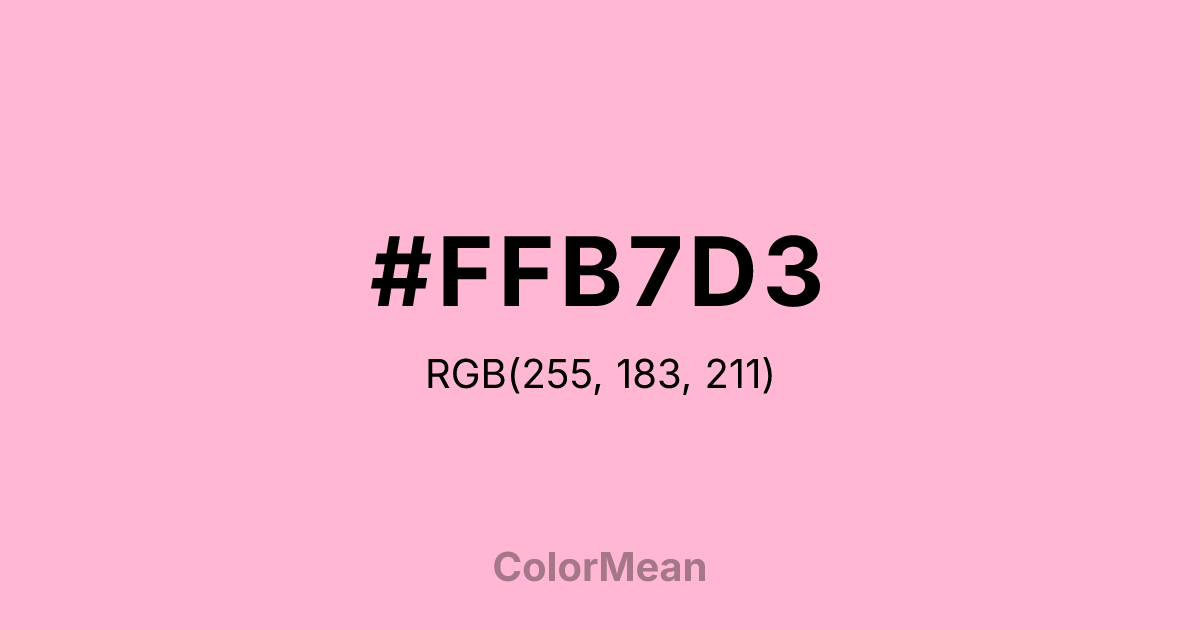 #FFB7D3 RGB value is (255, 183, 211). The hex color red value is 255, green is 183, and blue is 211. Its HSL format shows a hue of 337°, saturation of 100 percent, and lightness of 86 percent. The CMYK process values are 0 percent, 28 percent, 17 percent, 0 percent.