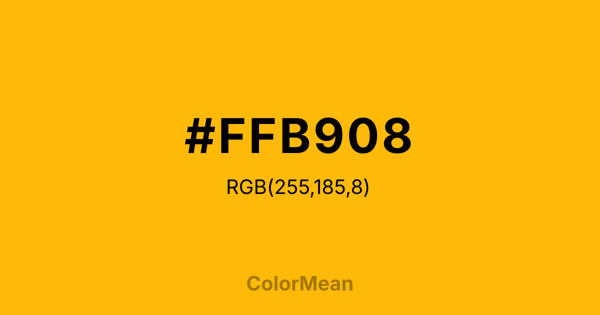 #FFB908 RGB value is (255, 185, 8). The hex color red value is 255, green is 185, and blue is 8. Its HSL format shows a hue of 43°, saturation of 100 percent, and lightness of 52 percent. The CMYK process values are 0 percent, 27 percent, 97 percent, 0 percent.