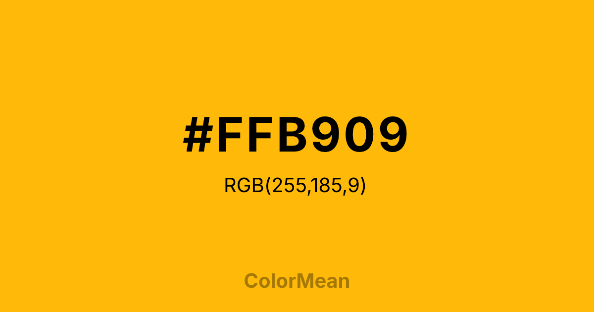 #FFB909 RGB value is (255, 185, 9). The hex color red value is 255, green is 185, and blue is 9. Its HSL format shows a hue of 43°, saturation of 100 percent, and lightness of 52 percent. The CMYK process values are 0 percent, 27 percent, 96 percent, 0 percent.
