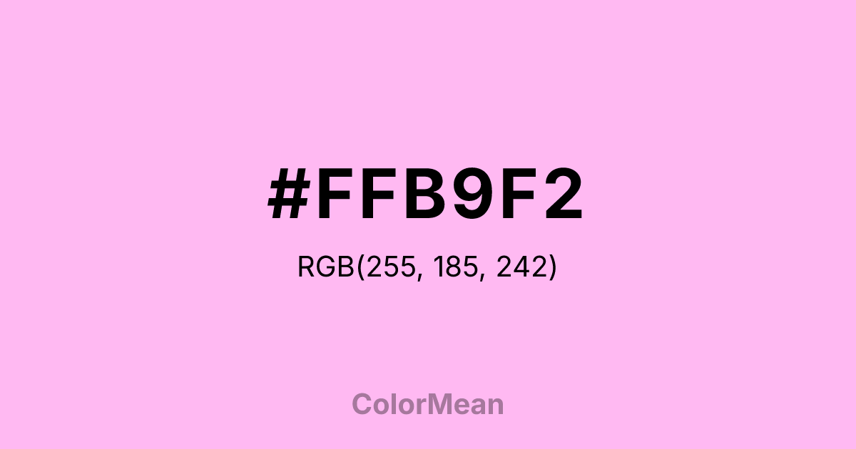 #FFB9F2 RGB value is (255, 185, 242). The hex color red value is 255, green is 185, and blue is 242. Its HSL format shows a hue of 311°, saturation of 100 percent, and lightness of 86 percent. The CMYK process values are 0 percent, 27 percent, 5 percent, 0 percent.