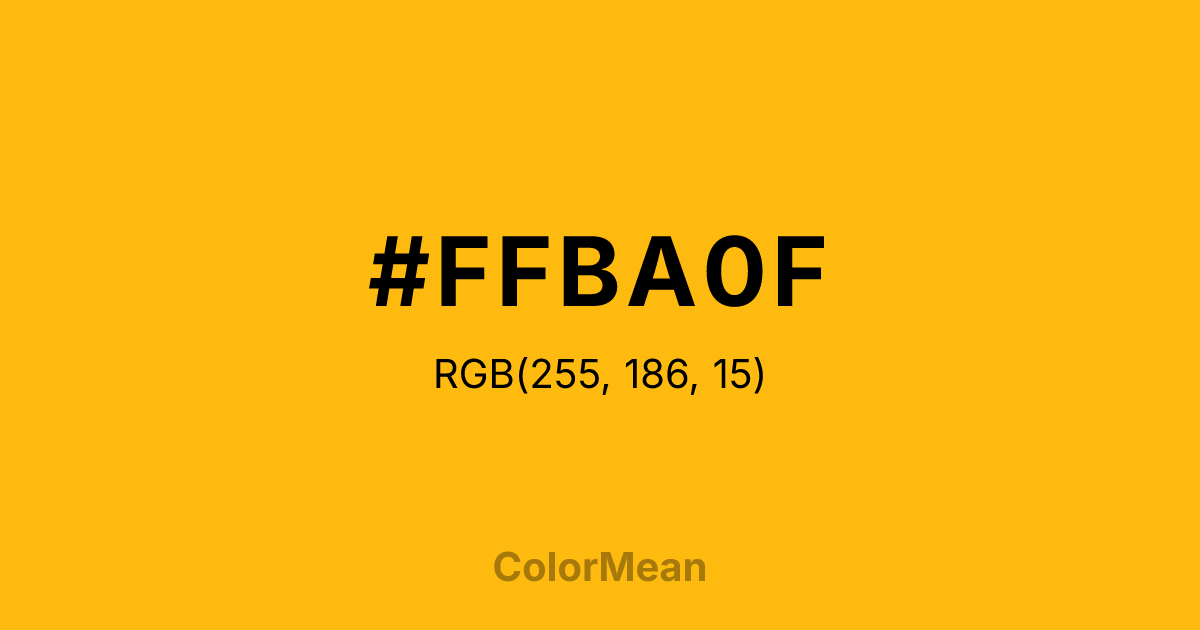#FFBA0F RGB value is (255, 186, 15). The hex color red value is 255, green is 186, and blue is 15. Its HSL format shows a hue of 43°, saturation of 100 percent, and lightness of 53 percent. The CMYK process values are 0 percent, 27 percent, 94 percent, 0 percent.
