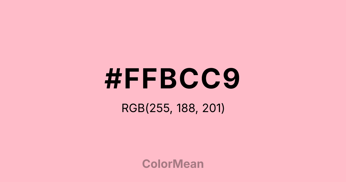 #FFBCC9 RGB value is (255, 188, 201). The hex color red value is 255, green is 188, and blue is 201. Its HSL format shows a hue of 348°, saturation of 100 percent, and lightness of 87 percent. The CMYK process values are 0 percent, 26 percent, 21 percent, 0 percent.