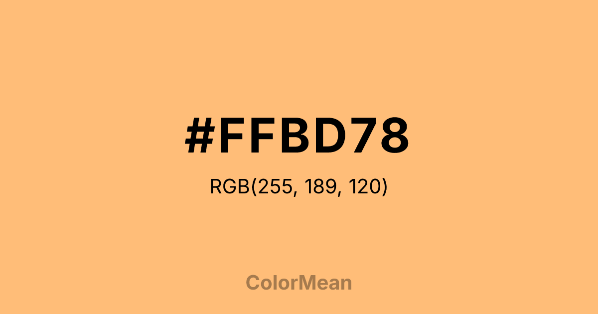 #FFBD78 RGB value is (255, 189, 120). The hex color red value is 255, green is 189, and blue is 120. Its HSL format shows a hue of 31°, saturation of 100 percent, and lightness of 74 percent. The CMYK process values are 0 percent, 26 percent, 53 percent, 0 percent.