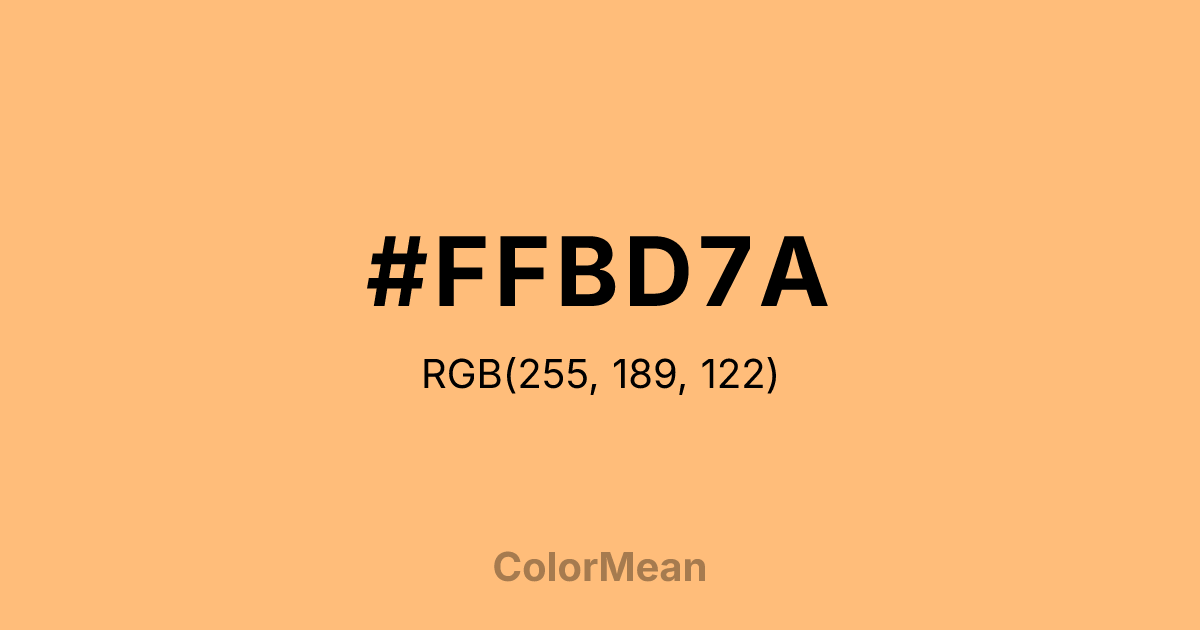 #FFBD7A RGB value is (255, 189, 122). The hex color red value is 255, green is 189, and blue is 122. Its HSL format shows a hue of 30°, saturation of 100 percent, and lightness of 74 percent. The CMYK process values are 0 percent, 26 percent, 52 percent, 0 percent.