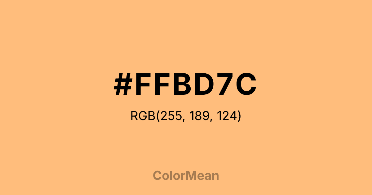 #FFBD7C RGB value is (255, 189, 124). The hex color red value is 255, green is 189, and blue is 124. Its HSL format shows a hue of 30°, saturation of 100 percent, and lightness of 74 percent. The CMYK process values are 0 percent, 26 percent, 51 percent, 0 percent.