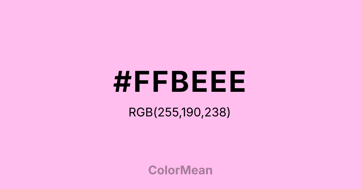#FFBEEE RGB value is (255, 190, 238). The hex color red value is 255, green is 190, and blue is 238. Its HSL format shows a hue of 316°, saturation of 100 percent, and lightness of 87 percent. The CMYK process values are 0 percent, 25 percent, 7 percent, 0 percent.