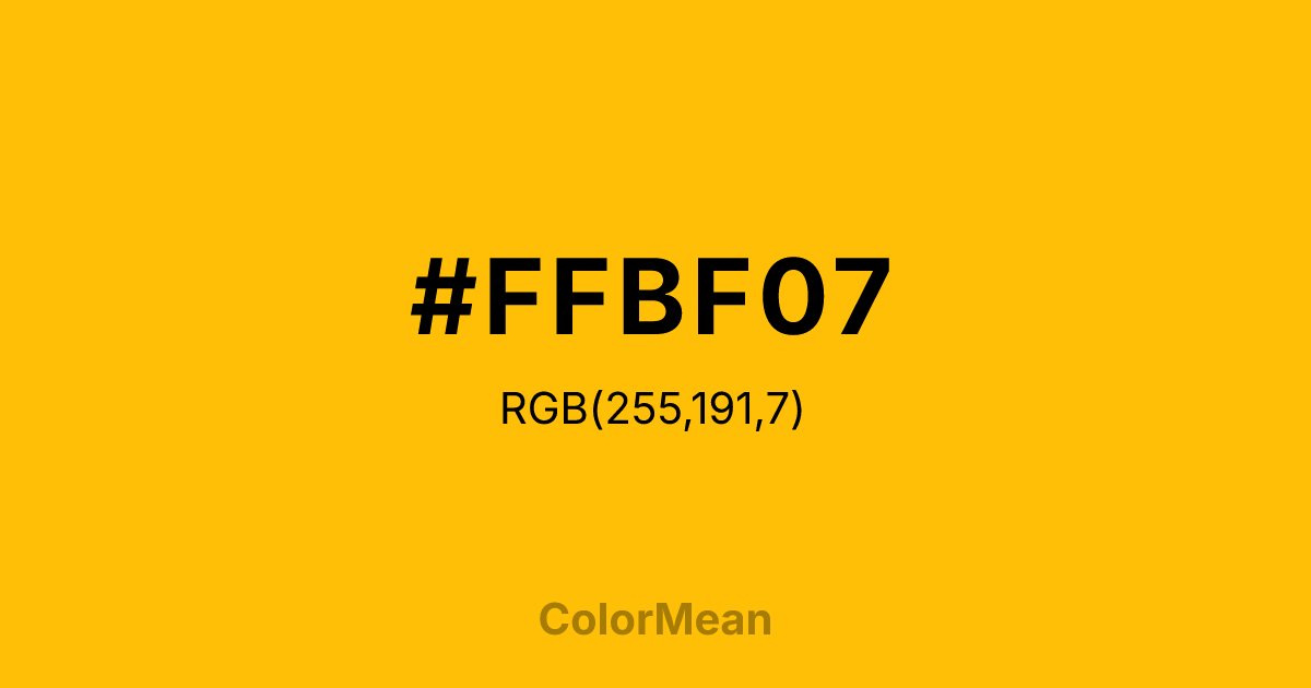 #FFBF07 RGB value is (255, 191, 7). The hex color red value is 255, green is 191, and blue is 7. Its HSL format shows a hue of 45°, saturation of 100 percent, and lightness of 51 percent. The CMYK process values are 0 percent, 25 percent, 97 percent, 0 percent.