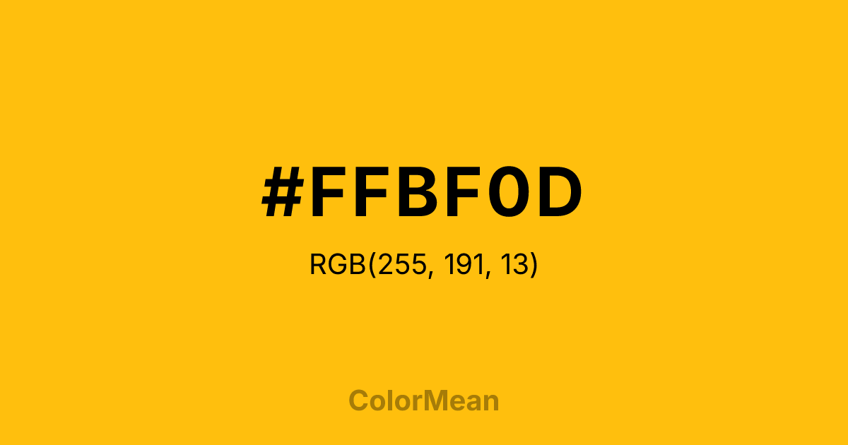 #FFBF0D RGB value is (255, 191, 13). The hex color red value is 255, green is 191, and blue is 13. Its HSL format shows a hue of 44°, saturation of 100 percent, and lightness of 53 percent. The CMYK process values are 0 percent, 25 percent, 95 percent, 0 percent.