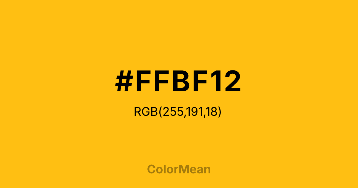 #FFBF12 RGB value is (255, 191, 18). The hex color red value is 255, green is 191, and blue is 18. Its HSL format shows a hue of 44°, saturation of 100 percent, and lightness of 54 percent. The CMYK process values are 0 percent, 25 percent, 93 percent, 0 percent.