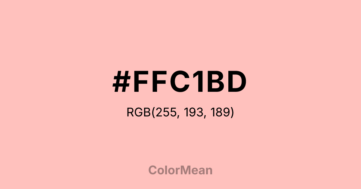 #FFC1BD RGB value is (255, 193, 189). The hex color red value is 255, green is 193, and blue is 189. Its HSL format shows a hue of 4°, saturation of 100 percent, and lightness of 87 percent. The CMYK process values are 0 percent, 24 percent, 26 percent, 0 percent.
