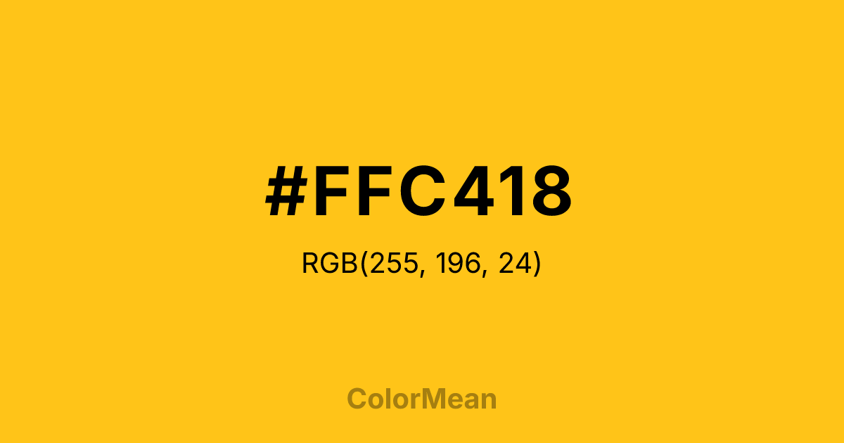 #FFC418 RGB value is (255, 196, 24). The hex color red value is 255, green is 196, and blue is 24. Its HSL format shows a hue of 45°, saturation of 100 percent, and lightness of 55 percent. The CMYK process values are 0 percent, 23 percent, 91 percent, 0 percent.