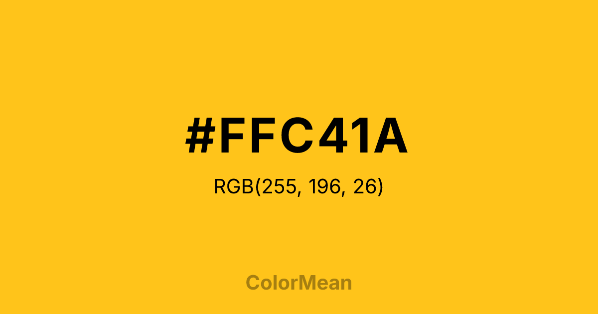 #FFC41A RGB value is (255, 196, 26). The hex color red value is 255, green is 196, and blue is 26. Its HSL format shows a hue of 45°, saturation of 100 percent, and lightness of 55 percent. The CMYK process values are 0 percent, 23 percent, 90 percent, 0 percent.