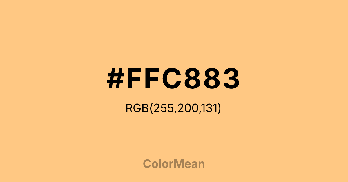 #FFC883 RGB value is (255, 200, 131). The hex color red value is 255, green is 200, and blue is 131. Its HSL format shows a hue of 33°, saturation of 100 percent, and lightness of 76 percent. The CMYK process values are 0 percent, 22 percent, 49 percent, 0 percent.