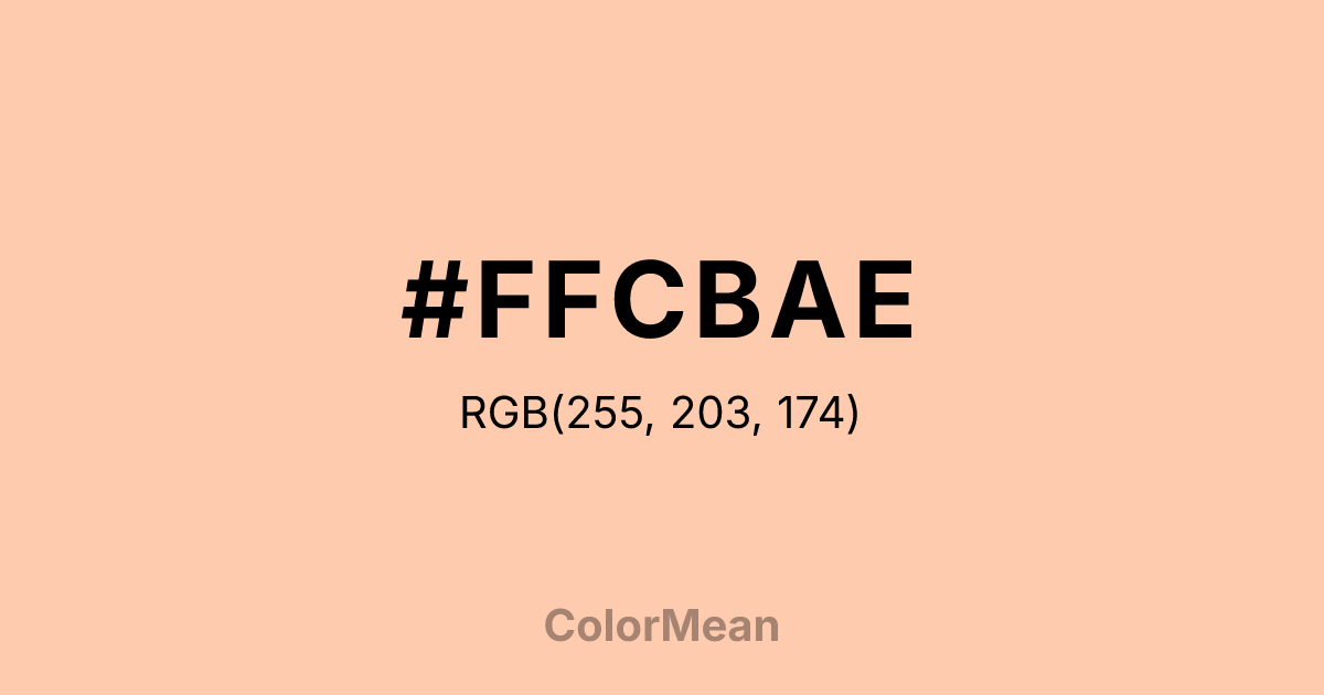 #FFCBAE RGB value is (255, 203, 174). The hex color red value is 255, green is 203, and blue is 174. Its HSL format shows a hue of 21°, saturation of 100 percent, and lightness of 84 percent. The CMYK process values are 0 percent, 20 percent, 32 percent, 0 percent.