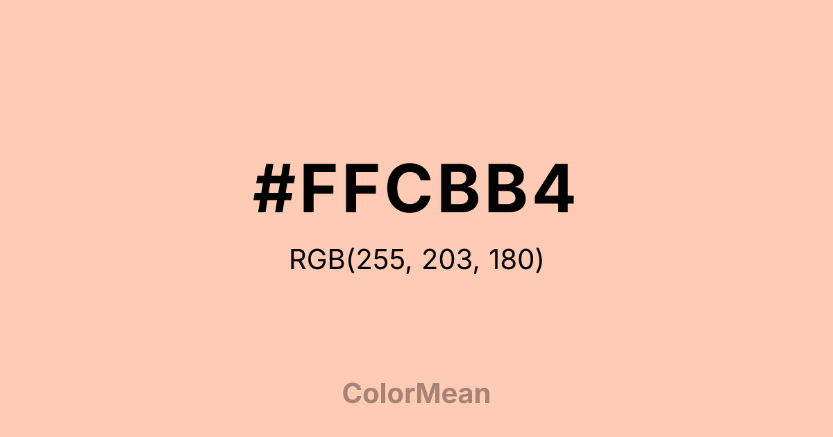 #FFCBB4 RGB value is (255, 203, 180). The hex color red value is 255, green is 203, and blue is 180. Its HSL format shows a hue of 18°, saturation of 100 percent, and lightness of 85 percent. The CMYK process values are 0 percent, 20 percent, 29 percent, 0 percent.
