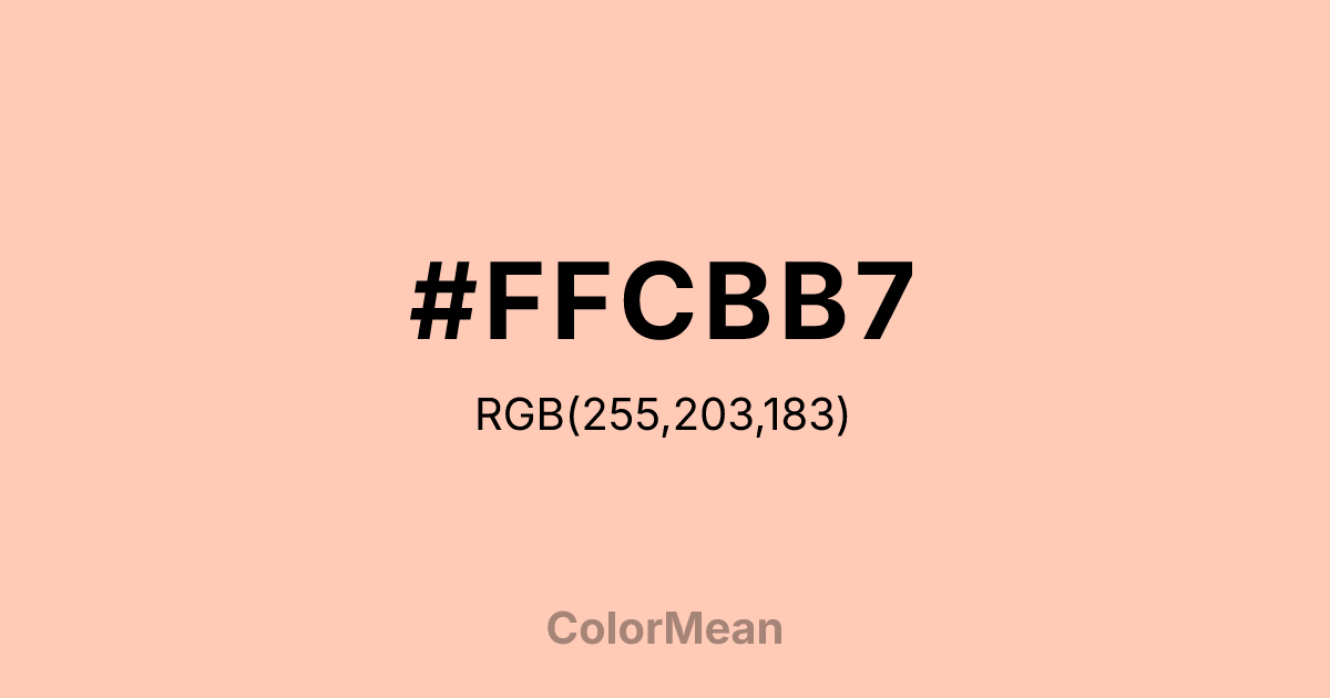 #FFCBB7 RGB value is (255, 203, 183). The hex color red value is 255, green is 203, and blue is 183. Its HSL format shows a hue of 17°, saturation of 100 percent, and lightness of 86 percent. The CMYK process values are 0 percent, 20 percent, 28 percent, 0 percent.