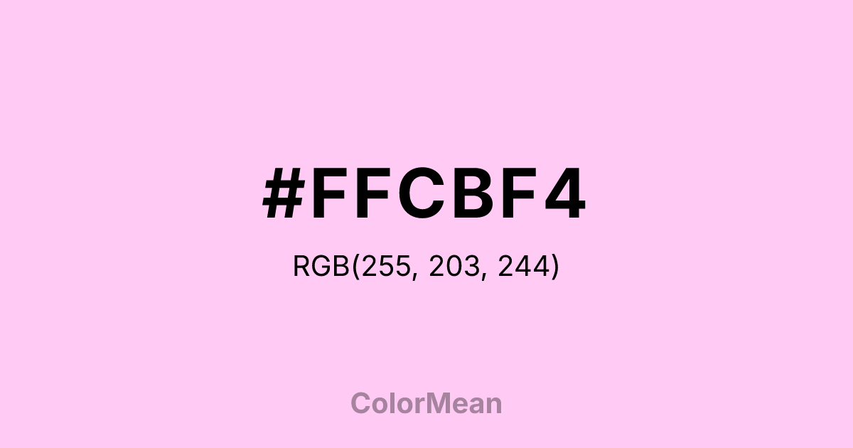 #FFCBF4 RGB value is (255, 203, 244). The hex color red value is 255, green is 203, and blue is 244. Its HSL format shows a hue of 313°, saturation of 100 percent, and lightness of 90 percent. The CMYK process values are 0 percent, 20 percent, 4 percent, 0 percent.