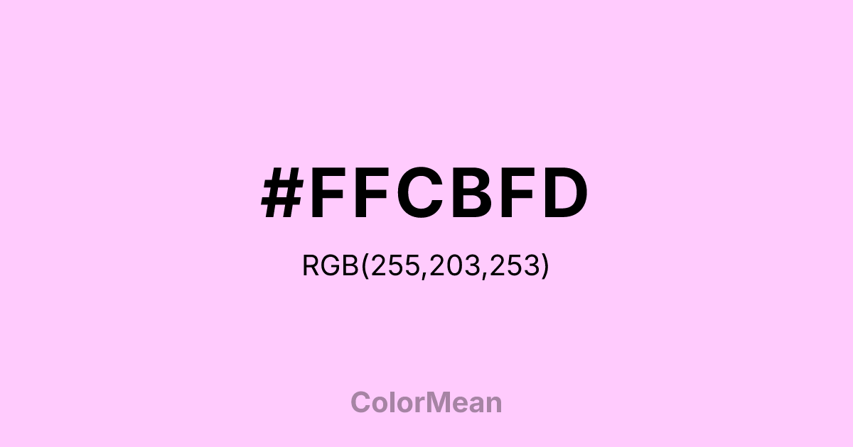 #FFCBFD RGB value is (255, 203, 253). The hex color red value is 255, green is 203, and blue is 253. Its HSL format shows a hue of 302°, saturation of 100 percent, and lightness of 90 percent. The CMYK process values are 0 percent, 20 percent, 1 percent, 0 percent.