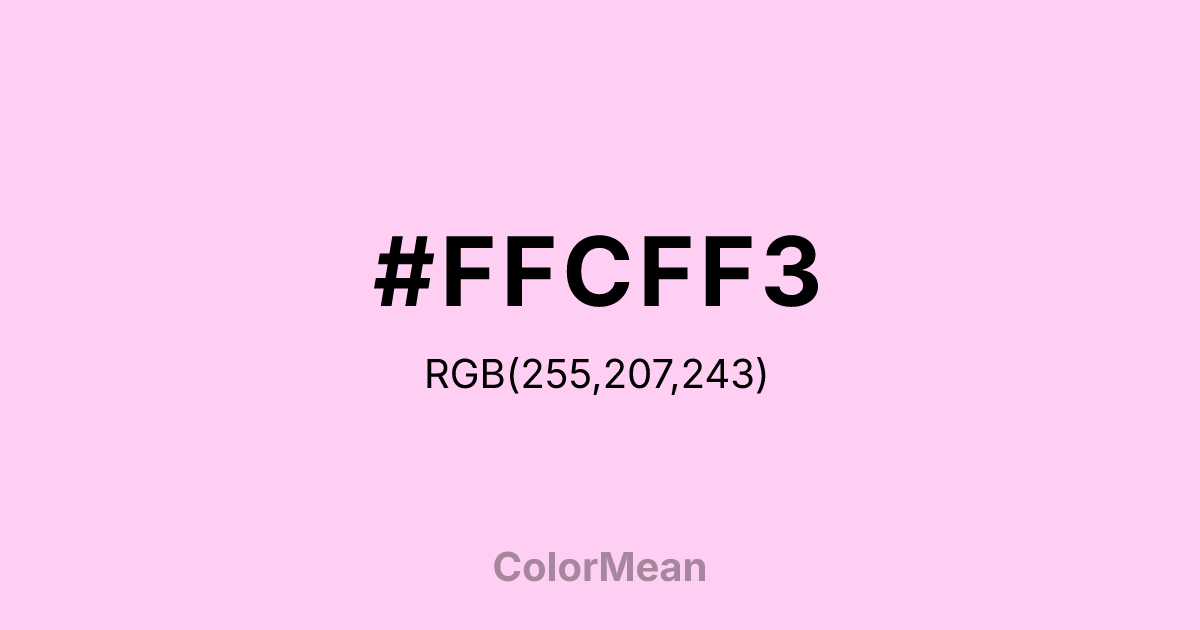#FFCFF3 RGB value is (255, 207, 243). The hex color red value is 255, green is 207, and blue is 243. Its HSL format shows a hue of 315°, saturation of 100 percent, and lightness of 91 percent. The CMYK process values are 0 percent, 19 percent, 5 percent, 0 percent.
