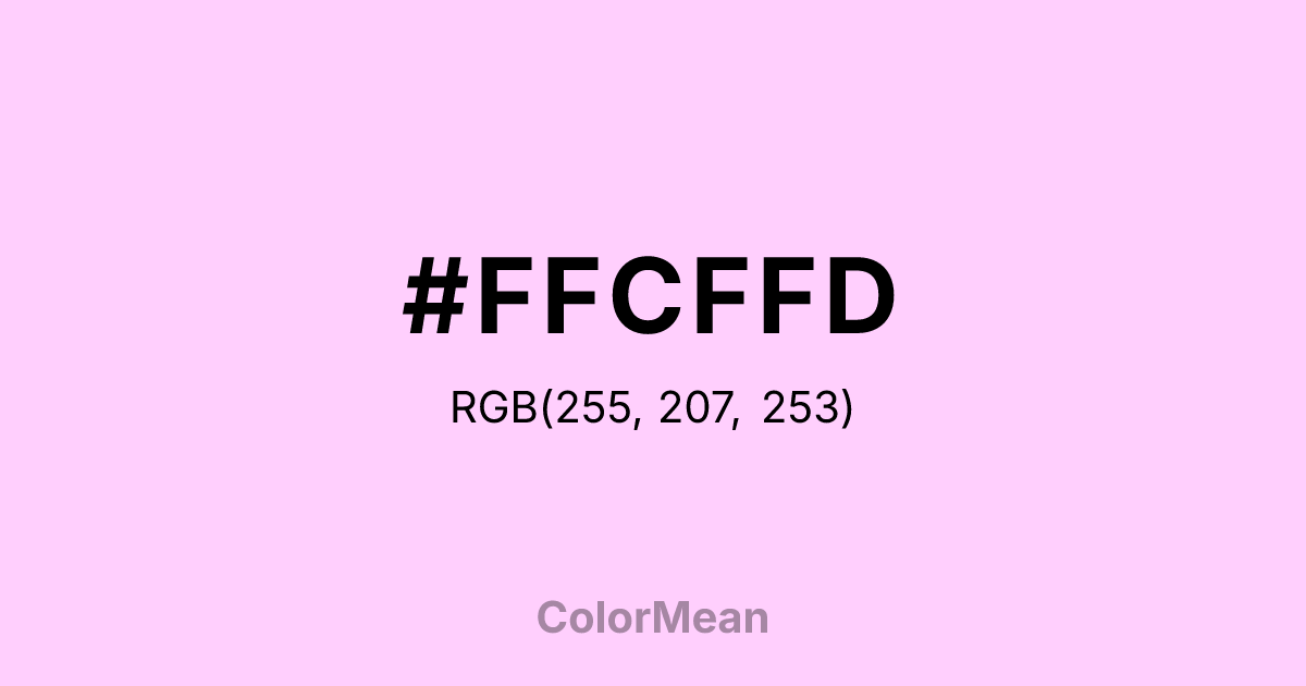 #FFCFFD RGB value is (255, 207, 253). The hex color red value is 255, green is 207, and blue is 253. Its HSL format shows a hue of 302°, saturation of 100 percent, and lightness of 91 percent. The CMYK process values are 0 percent, 19 percent, 1 percent, 0 percent.