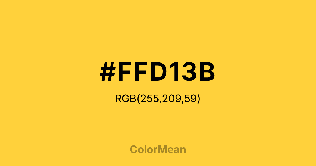 #FFD13B RGB value is (255, 209, 59). The hex color red value is 255, green is 209, and blue is 59. Its HSL format shows a hue of 46°, saturation of 100 percent, and lightness of 62 percent. The CMYK process values are 0 percent, 18 percent, 77 percent, 0 percent.