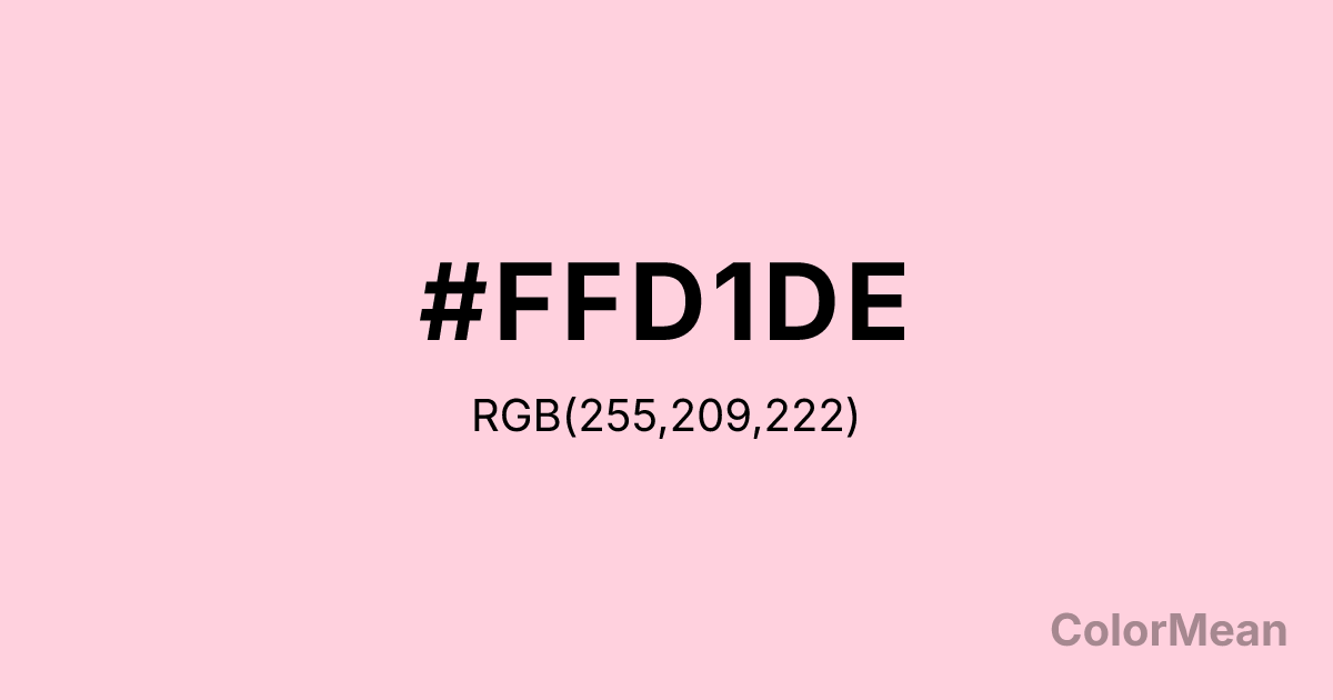 #FFD1DE RGB value is (255, 209, 222). The hex color red value is 255, green is 209, and blue is 222. Its HSL format shows a hue of 343°, saturation of 100 percent, and lightness of 91 percent. The CMYK process values are 0 percent, 18 percent, 13 percent, 0 percent.