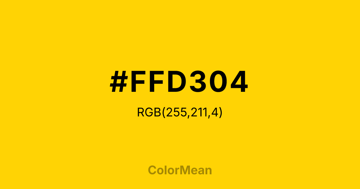#FFD304 RGB value is (255, 211, 4). The hex color red value is 255, green is 211, and blue is 4. Its HSL format shows a hue of 49°, saturation of 100 percent, and lightness of 51 percent. The CMYK process values are 0 percent, 17 percent, 98 percent, 0 percent.