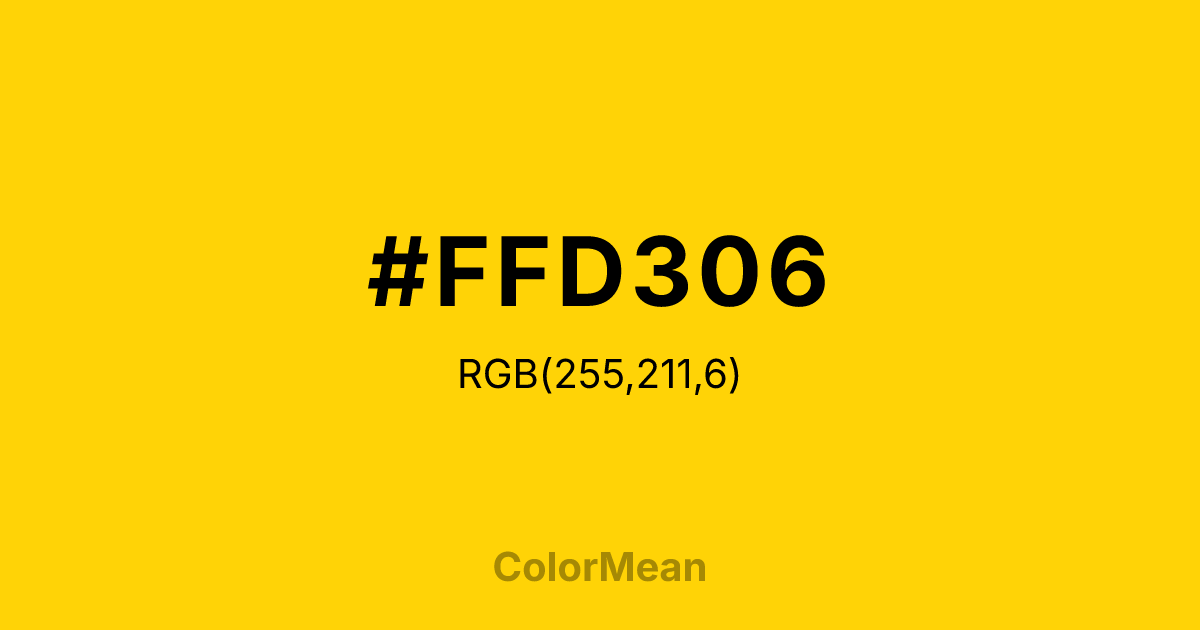 #FFD306 RGB value is (255, 211, 6). The hex color red value is 255, green is 211, and blue is 6. Its HSL format shows a hue of 49°, saturation of 100 percent, and lightness of 51 percent. The CMYK process values are 0 percent, 17 percent, 98 percent, 0 percent.