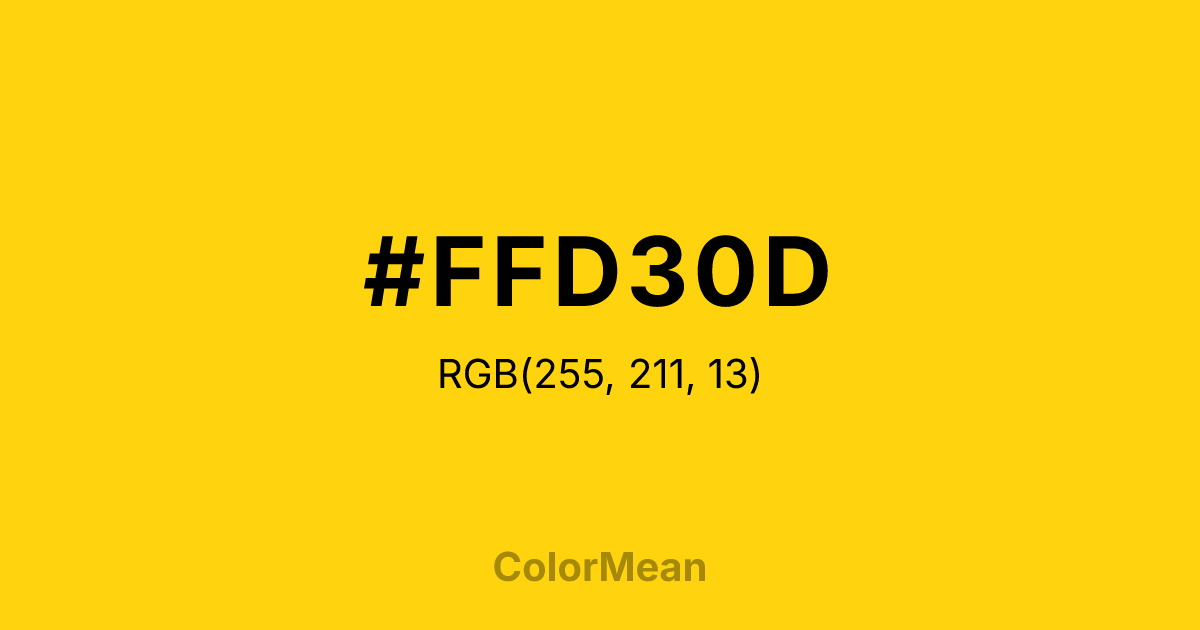 #FFD30D RGB value is (255, 211, 13). The hex color red value is 255, green is 211, and blue is 13. Its HSL format shows a hue of 49°, saturation of 100 percent, and lightness of 53 percent. The CMYK process values are 0 percent, 17 percent, 95 percent, 0 percent.
