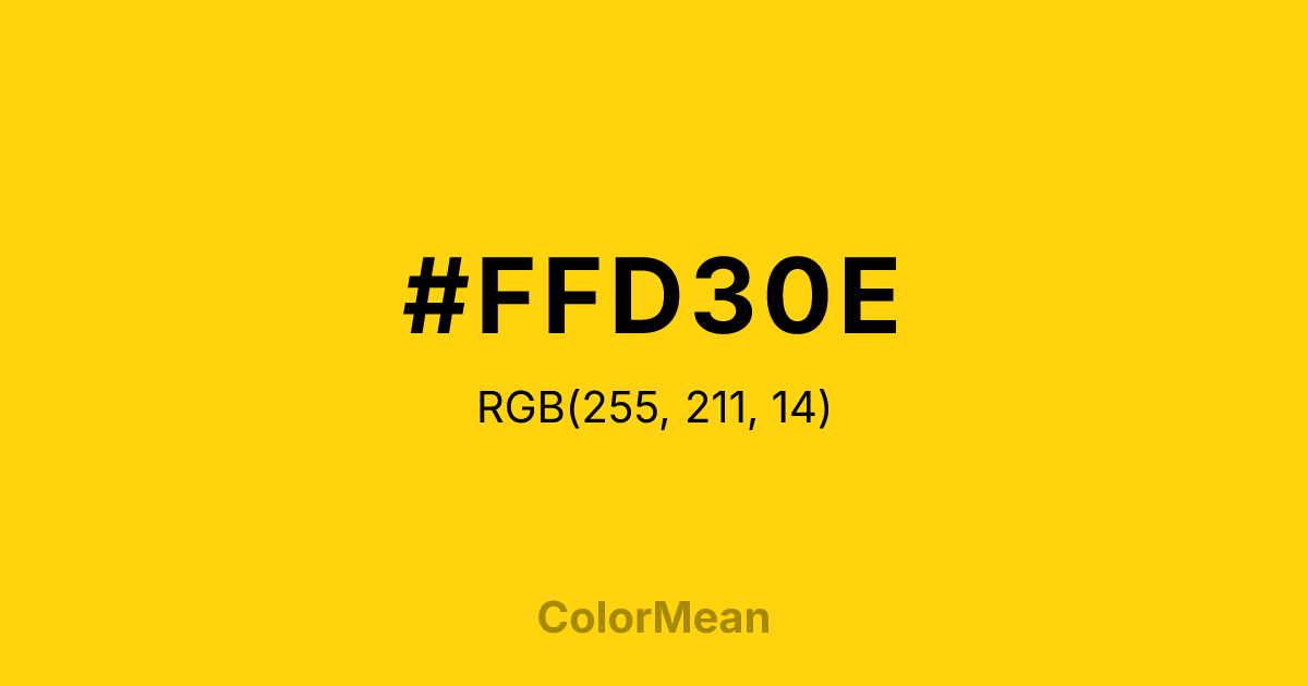 #FFD30E RGB value is (255, 211, 14). The hex color red value is 255, green is 211, and blue is 14. Its HSL format shows a hue of 49°, saturation of 100 percent, and lightness of 53 percent. The CMYK process values are 0 percent, 17 percent, 95 percent, 0 percent.