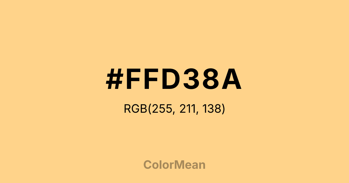 #FFD38A RGB value is (255, 211, 138). The hex color red value is 255, green is 211, and blue is 138. Its HSL format shows a hue of 37°, saturation of 100 percent, and lightness of 77 percent. The CMYK process values are 0 percent, 17 percent, 46 percent, 0 percent.