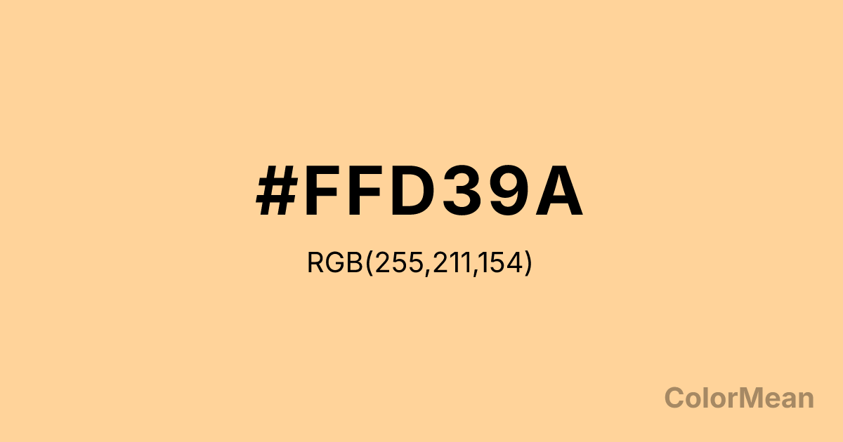 #FFD39A RGB value is (255, 211, 154). The hex color red value is 255, green is 211, and blue is 154. Its HSL format shows a hue of 34°, saturation of 100 percent, and lightness of 80 percent. The CMYK process values are 0 percent, 17 percent, 40 percent, 0 percent.