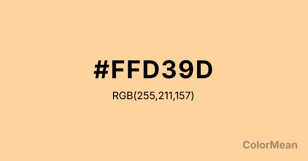 #FFD39D RGB value is (255, 211, 157). The hex color red value is 255, green is 211, and blue is 157. Its HSL format shows a hue of 33°, saturation of 100 percent, and lightness of 81 percent. The CMYK process values are 0 percent, 17 percent, 38 percent, 0 percent.