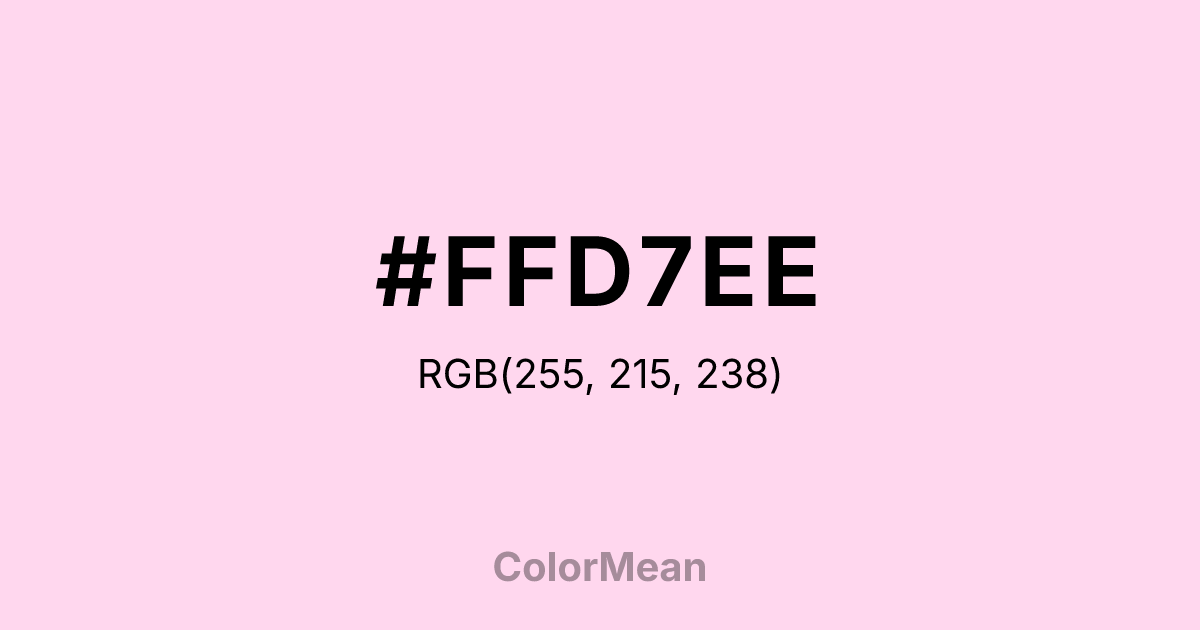 #FFD7EE RGB value is (255, 215, 238). The hex color red value is 255, green is 215, and blue is 238. Its HSL format shows a hue of 326°, saturation of 100 percent, and lightness of 92 percent. The CMYK process values are 0 percent, 16 percent, 7 percent, 0 percent.