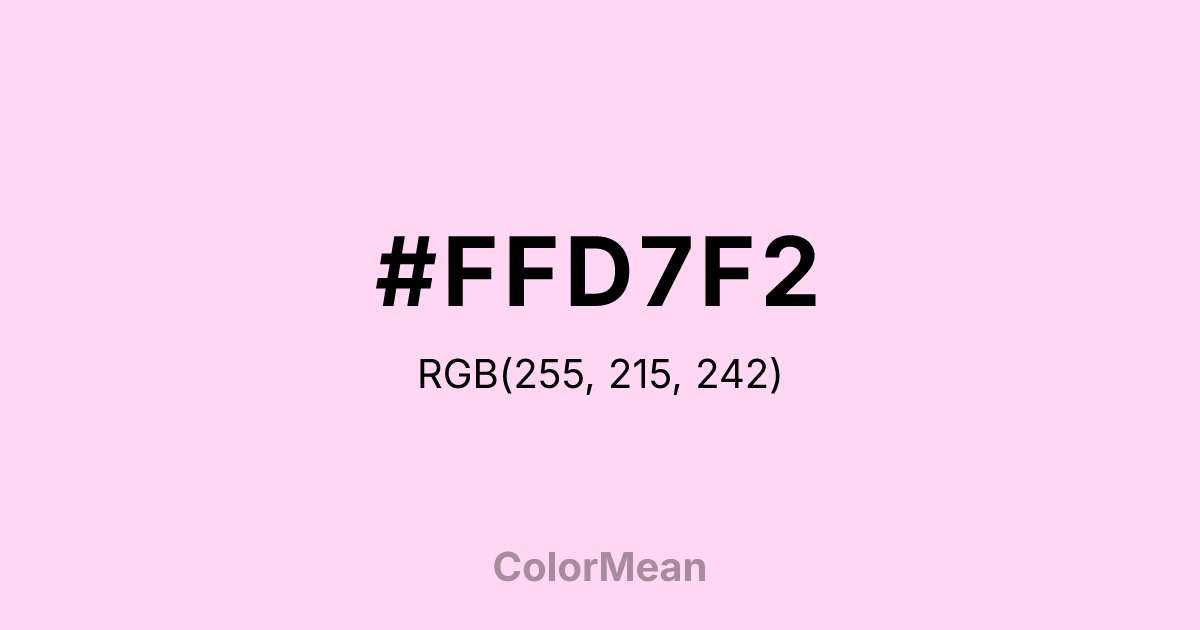 #FFD7F2 RGB value is (255, 215, 242). The hex color red value is 255, green is 215, and blue is 242. Its HSL format shows a hue of 320°, saturation of 100 percent, and lightness of 92 percent. The CMYK process values are 0 percent, 16 percent, 5 percent, 0 percent.