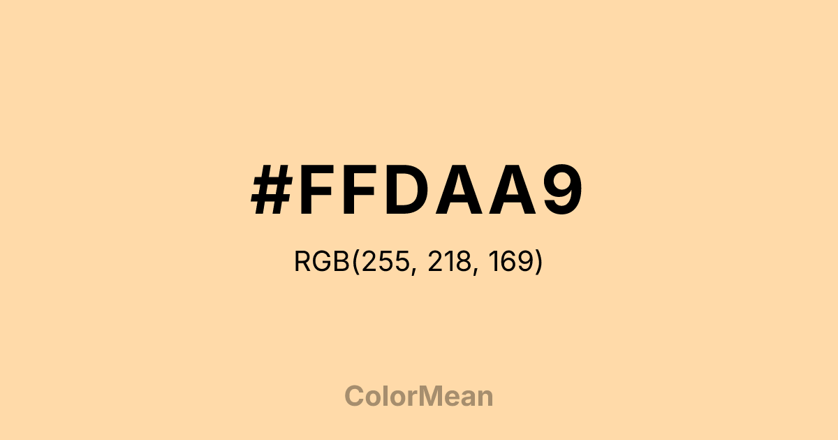 #FFDAA9 RGB value is (255, 218, 169). The hex color red value is 255, green is 218, and blue is 169. Its HSL format shows a hue of 34°, saturation of 100 percent, and lightness of 83 percent. The CMYK process values are 0 percent, 15 percent, 34 percent, 0 percent.