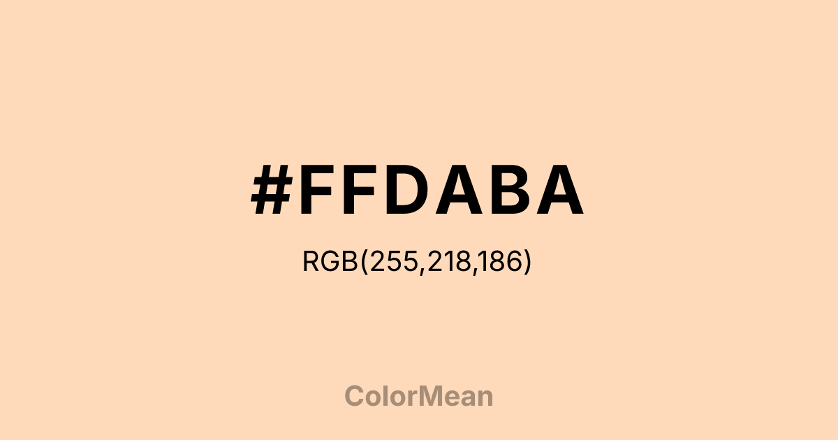 #FFDABA RGB value is (255, 218, 186). The hex color red value is 255, green is 218, and blue is 186. Its HSL format shows a hue of 28°, saturation of 100 percent, and lightness of 86 percent. The CMYK process values are 0 percent, 15 percent, 27 percent, 0 percent.