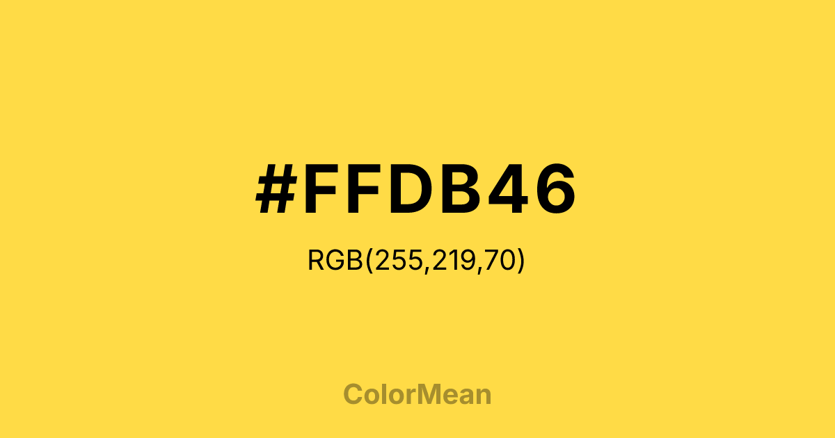 #FFDB46 RGB value is (255, 219, 70). The hex color red value is 255, green is 219, and blue is 70. Its HSL format shows a hue of 48°, saturation of 100 percent, and lightness of 64 percent. The CMYK process values are 0 percent, 14 percent, 73 percent, 0 percent.