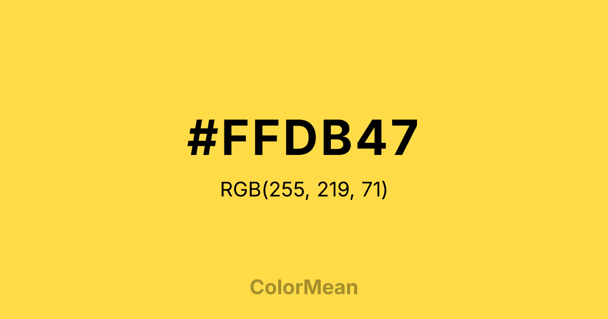 #FFDB47 RGB value is (255, 219, 71). The hex color red value is 255, green is 219, and blue is 71. Its HSL format shows a hue of 48°, saturation of 100 percent, and lightness of 64 percent. The CMYK process values are 0 percent, 14 percent, 72 percent, 0 percent.