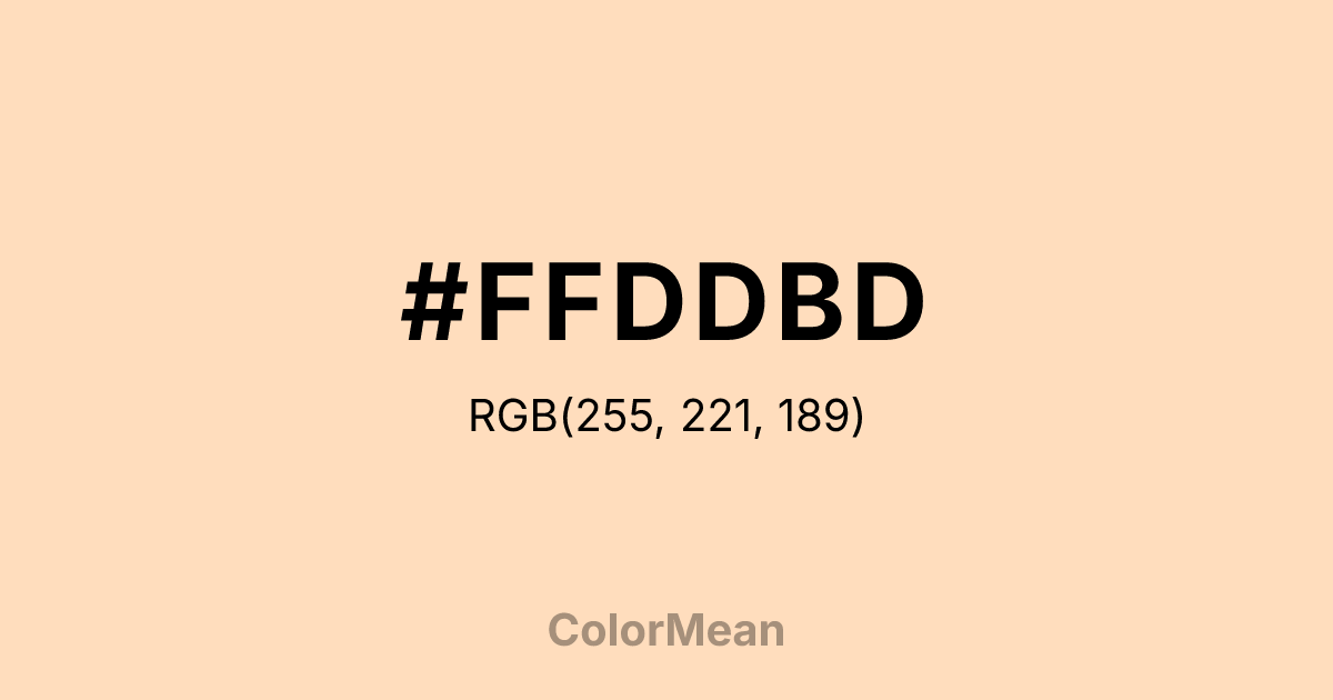 #FFDDBD RGB value is (255, 221, 189). The hex color red value is 255, green is 221, and blue is 189. Its HSL format shows a hue of 29°, saturation of 100 percent, and lightness of 87 percent. The CMYK process values are 0 percent, 13 percent, 26 percent, 0 percent.